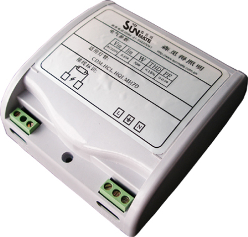 HID电子镇流器 1.大幅度降低照明系统其它组成部分的初始投资和运行成本. 2.自始至终为照明系统的最终用户提供令人非常满意的照明效果. 3.大大简化照明系统设计、 缩短设计周期、降低设计成本. 特点 1.低频方波,光源无频闪 2.恒定助率输出,色温致性良好 3.效率高,功耗小,比电感式镇流器节电30% 4.光源异常时镇流器安全判断输出及启动时间控制系统,避免光源寿终时导致的循环启动,出避免光源和灯头过热 5.接地电阻小,泄漏电流小于3mA产品可靠 经济: 1.跟传统电感镇流器比,灯寿命最大延长50% 2.系统功率损耗低20%,使灯具更经济 3.低的发热量意味着节省的空调费用