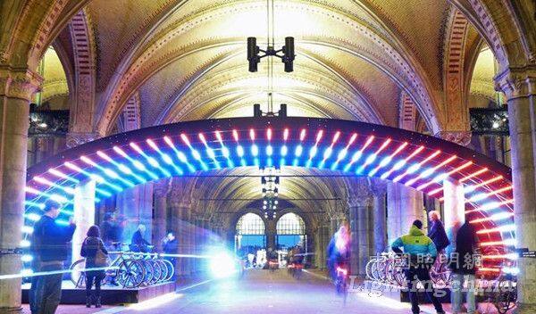 导语: 该项目为荷兰国家博物馆通道照明与自行车灯战。light battle 由近5000日光灯管组成,路人踩踏明亮的蓝色和红色的灯光从走道的一边到另一边,因而产生能量,以光的形式传送。