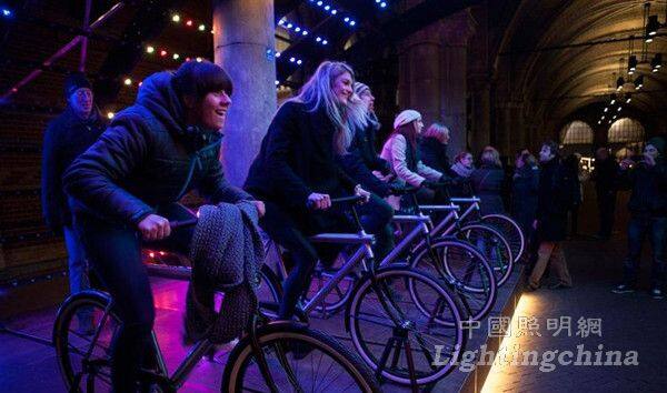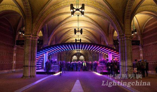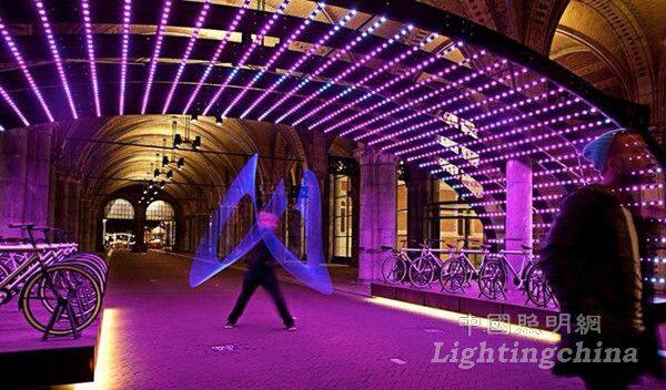 该项目为荷兰国家博物馆通道照明与自行车灯战。light battle 由近5000日光灯管组成,路人踩踏明亮的蓝色和红色的灯光从走道的一边到另一边,因而产生能量,以光的形式传送。