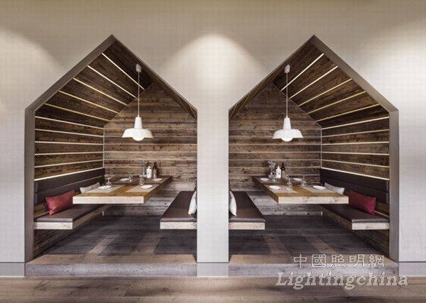 DITTEL ARCHITEKTEN被交付设计这个230㎡餐厅的任务,餐饮界的两强品牌Breuninger 和Sansibar,要在同一屋檐下和谐统一。为了体验叙尔特岛的气氛,设计师采用了一些典型的材料,比如旧木材制成的镶板和橡木桌子。特别的雅座创造出酒窖的氛围,墙壁和天花板像叠起来的酒箱,展示柜里各式各样的酒瓶被灯光衬托得犹如艺术品。