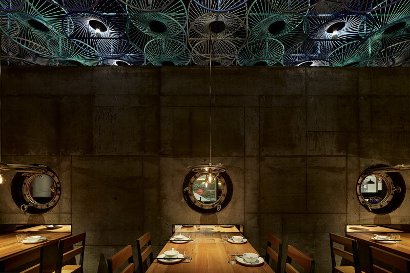 为了精益求精,设计师们增添了一堵水泥墙,而舷窗就在开于其上。在长条形的桌子之间,将它们分割成一个有趣的用餐空间,形成别样的用餐体验,让不熟悉的顾客能够保留一定的私密性和距离感。而舷窗的设计上,设计师们又加上了灯光,起到烘托氛围的作用,这个灯光的光源是餐桌顶上的射灯,还将射灯的光线稍微调弱,使得用餐时会更加舒适、温馨!