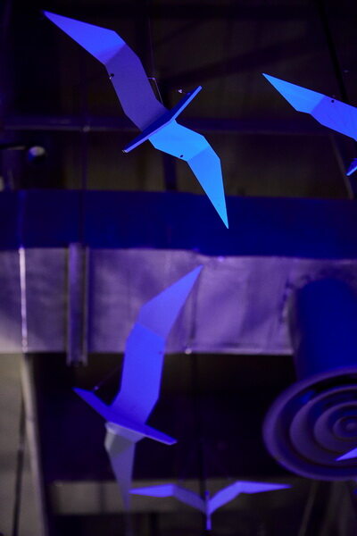 把海鸥的造型抽象化,并用钢板制成,配以了蓝色喷漆,高低参差的悬挂着。也许,舟山看不见那么多海鸥,但设计师对海文化的一个深刻印象与寄托,于是有了这样的一个特别的设计概念。