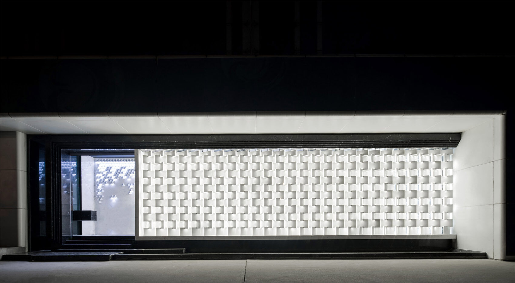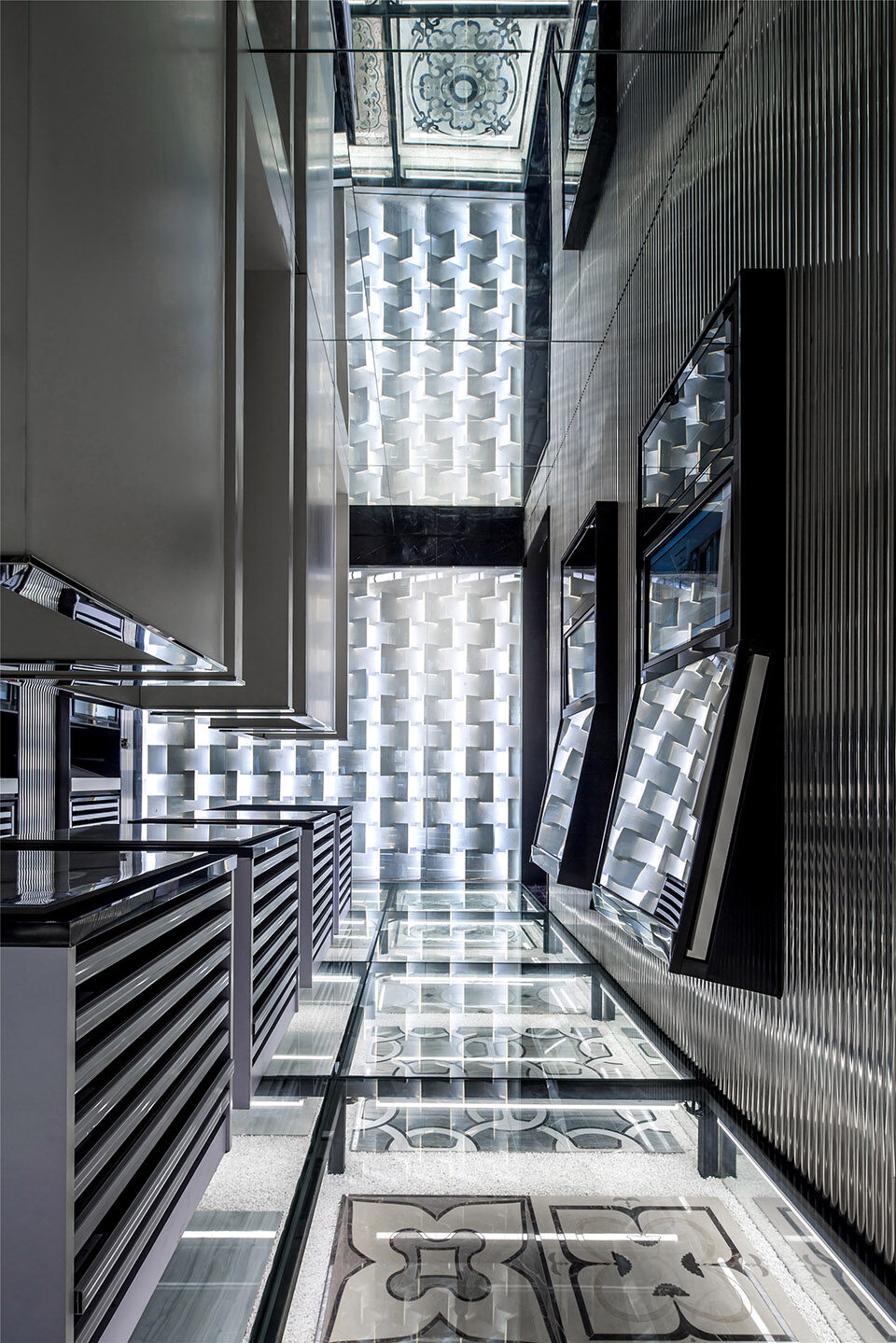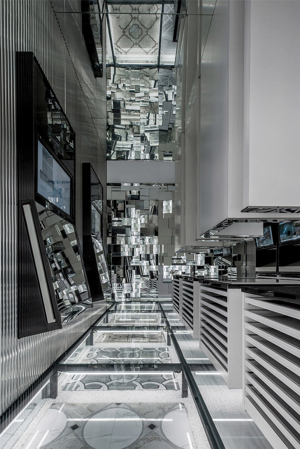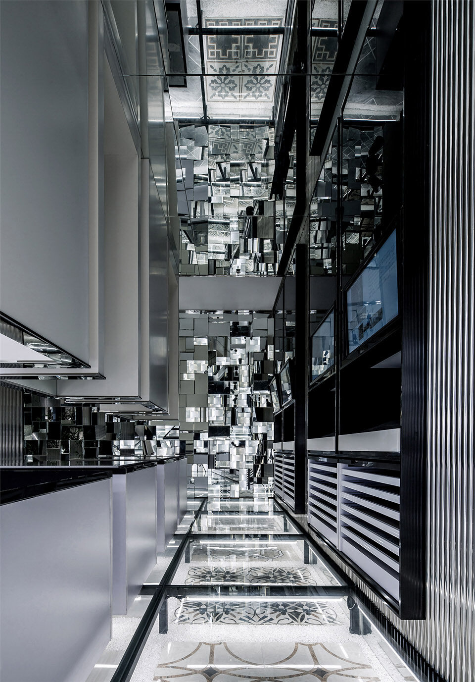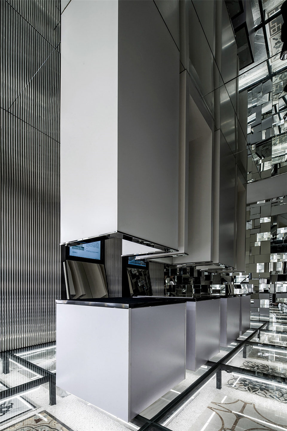 转身回望,几何形态幕墙与光线镜面交织往复,空间氛围清澈冷静。顶部的镜面玻璃更将时空拉伸至不可触及的三维空间,多层次的表达精妙的花纹图案和设计语言。