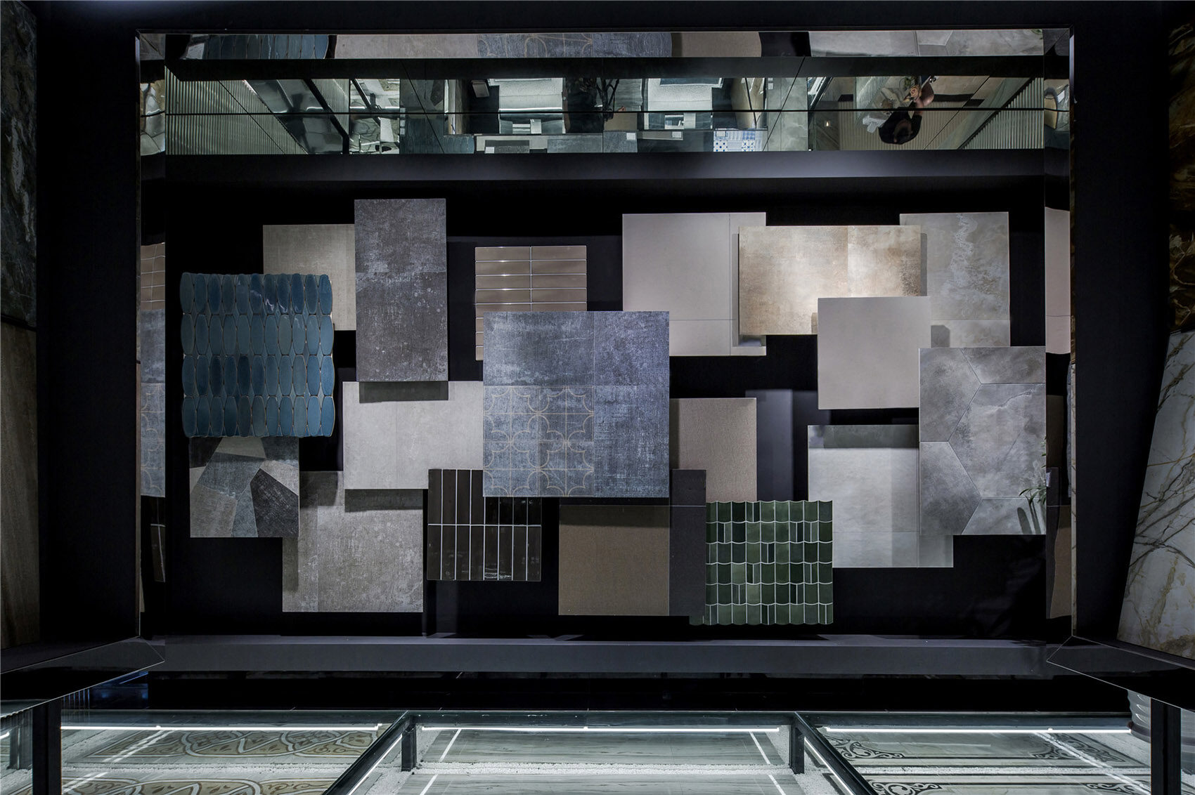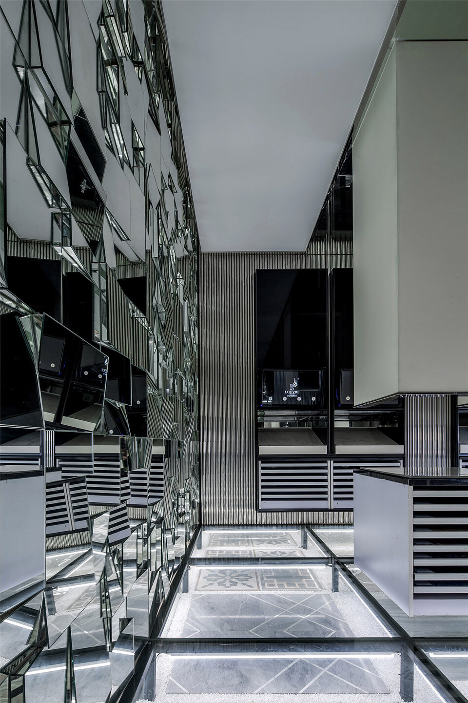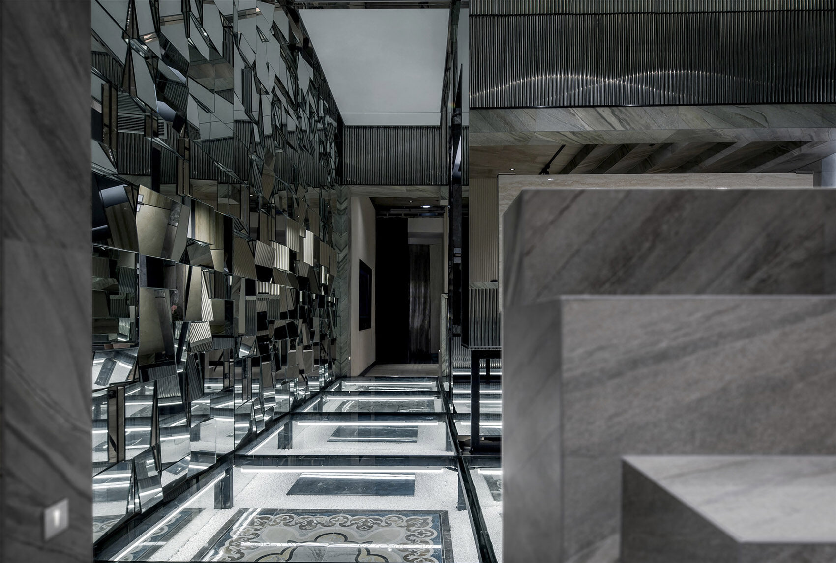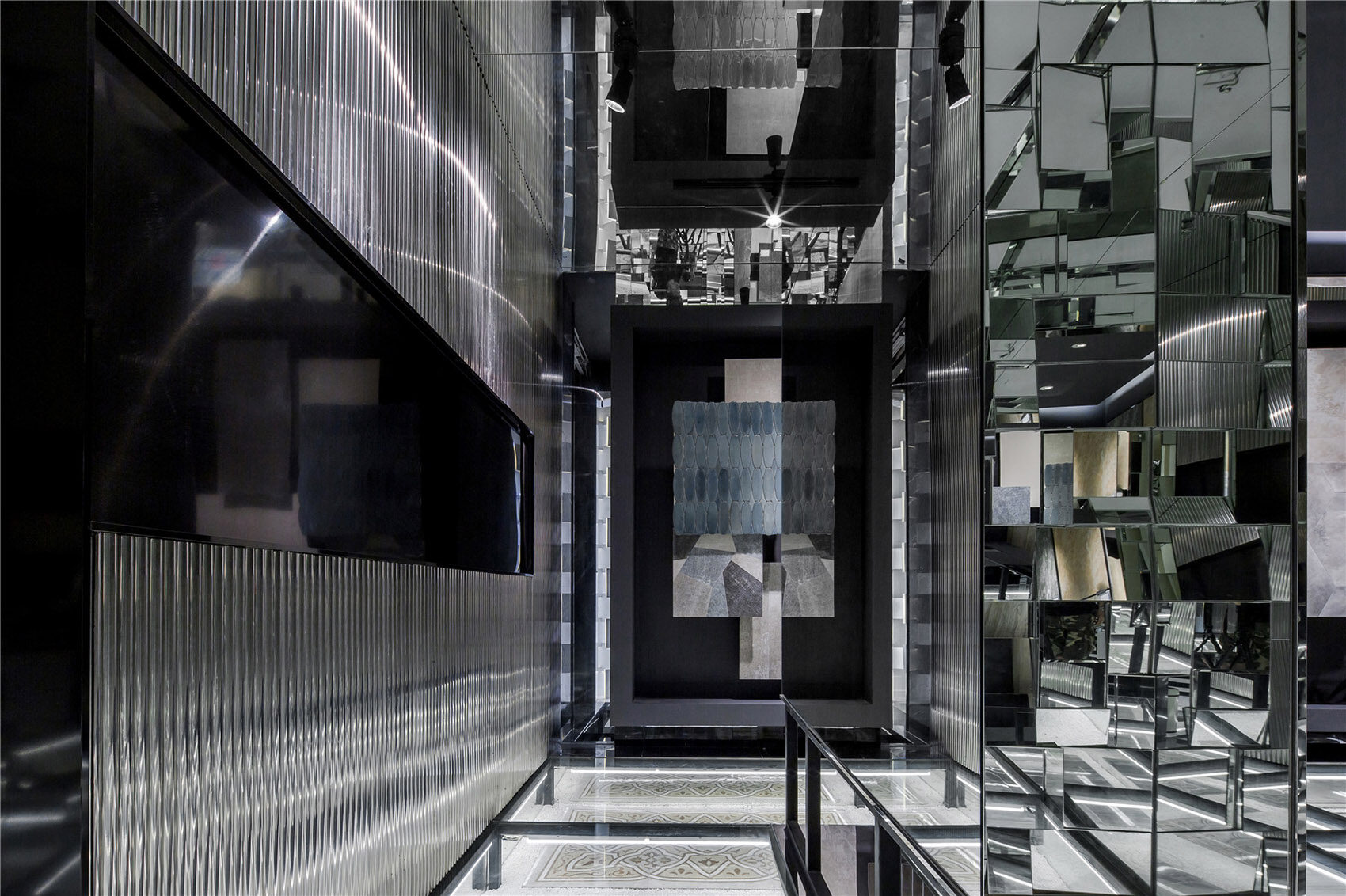 空间体验由色彩交织、材质搭配、空间几何语言组合形成。其展示了空间自身的冷静、清澈的气质特征,为冷灰色基调提供绝佳的契合点。几何形体的阵列与铺贴,配合着暗冷色基调形成清爽、理智的博物馆体验氛围。几何形态代表理智和秩序,在不同的铺贴运用中,却展现截然不一样的体验传递。竖向纤细的几何纹样传达冷静、规律、恬静。交织拼贴的玻璃镜面几何设计,却带给人光怪陆离的思维导向,牵引出无限的遐想。