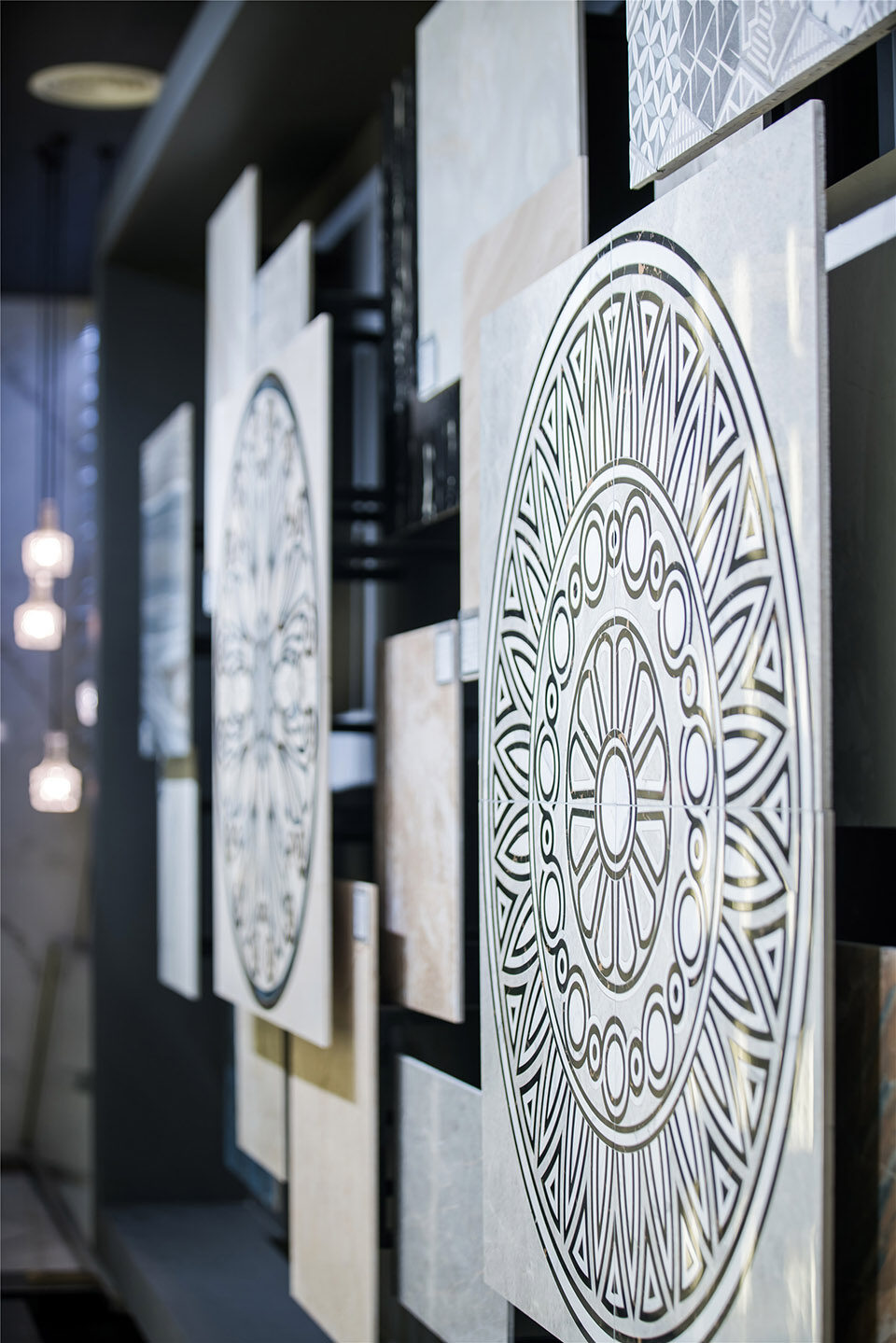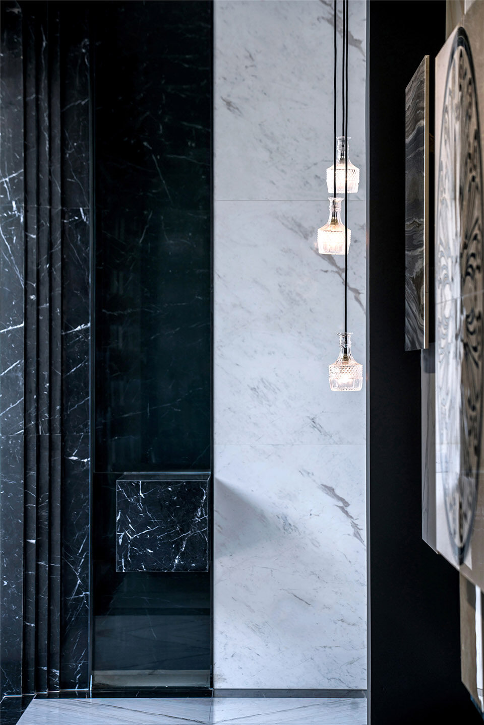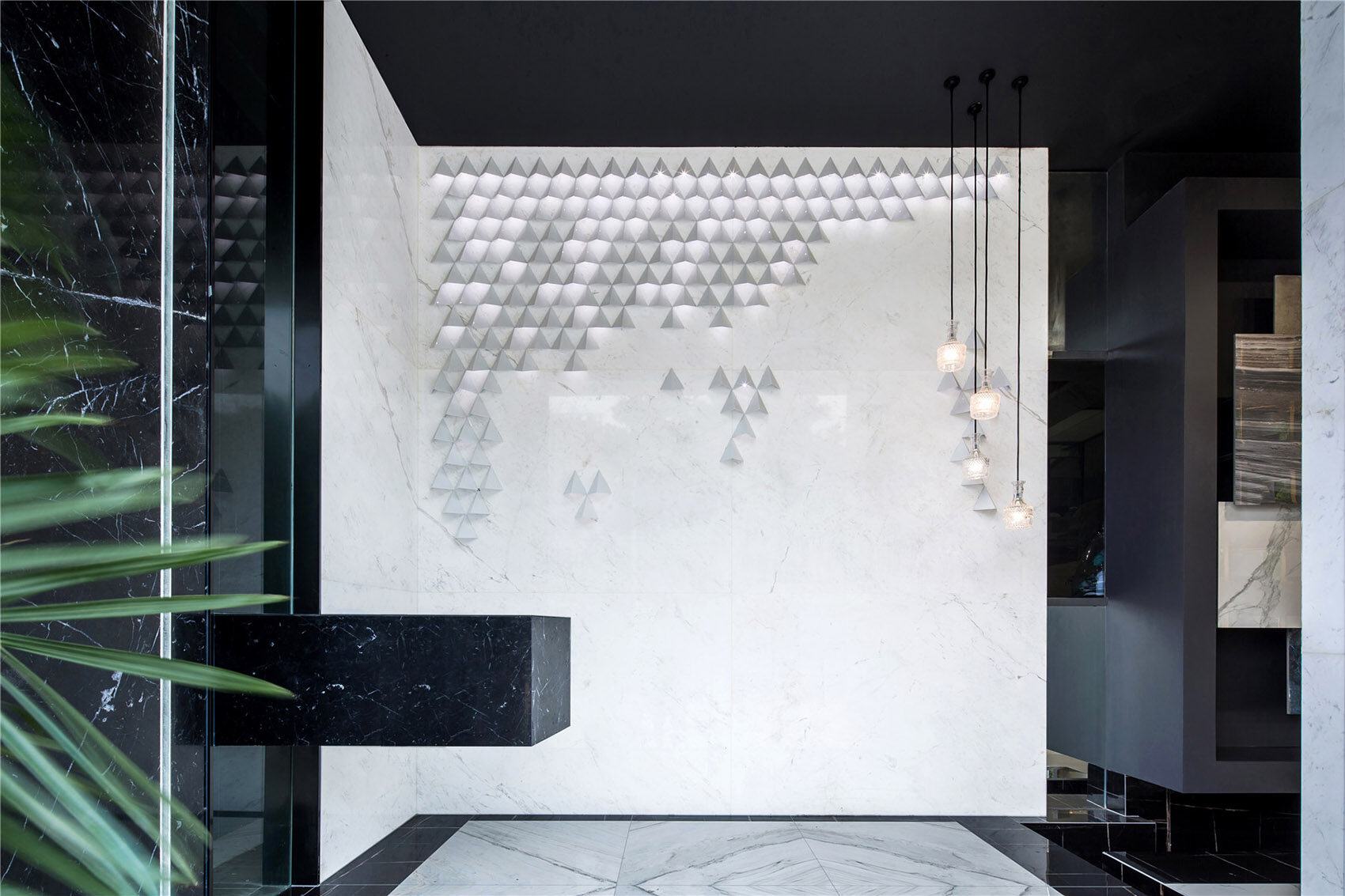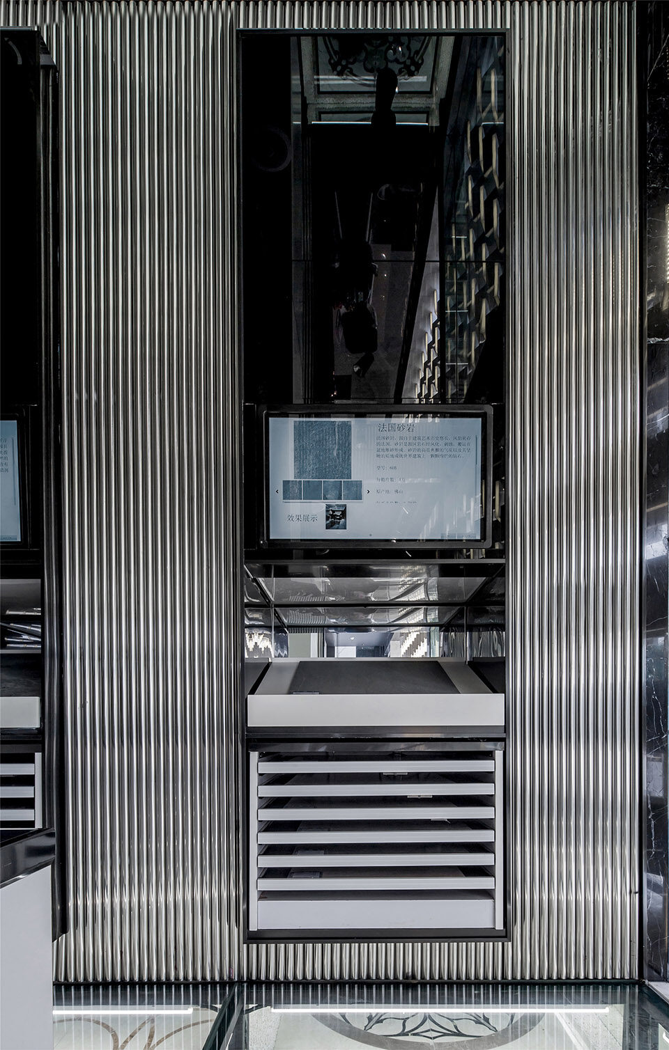 空间体验由色彩交织、材质搭配、空间几何语言组合形成。其展示了空间自身的冷静、清澈的气质特征,为冷灰色基调提供绝佳的契合点。几何形体的阵列与铺贴,配合着暗冷色基调形成清爽、理智的博物馆体验氛围。几何形态代表理智和秩序,在不同的铺贴运用中,却展现截然不一样的体验传递。竖向纤细的几何纹样传达冷静、规律、恬静。交织拼贴的玻璃镜面几何设计,却带给人光怪陆离的思维导向,牵引出无限的遐想。