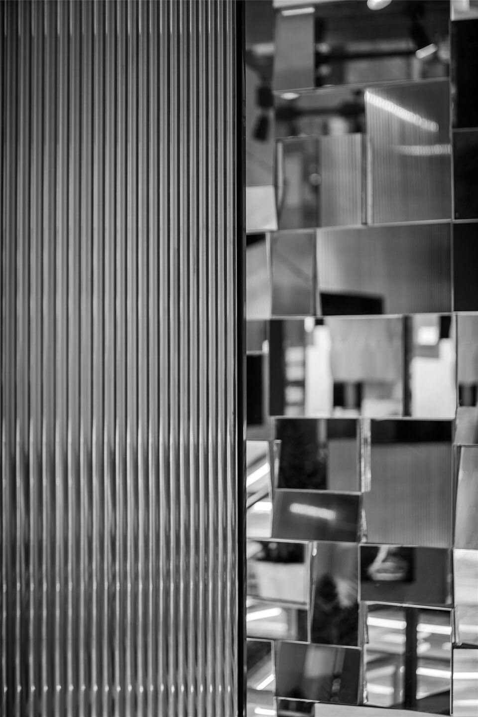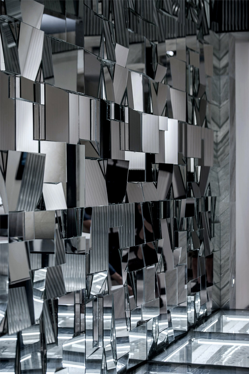 秩序与自由、理智与凌乱,空间自身体验带来更高层面的哲学思考。但就材质本身气质,却如此接近。所不同的是对待光线的方式,反映出不同材质在不同层面的独特艺术特征。玻璃镜面交错层叠,看似破碎无序,冰冷杂乱。其中富含对时空多样化的语言解读,并导引人的思绪在缤纷多彩的光线魔术面前静心与联想。