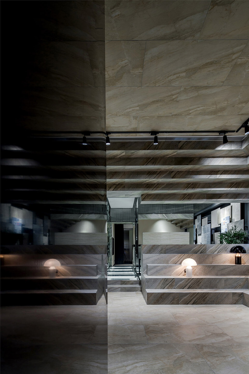 清晰如新的光影,倒影触手可及的现实。阶梯空间提供设计师和供应商及业主交流、分享的空间。在这里,扬弃玻璃镜面拉伸层次的设计方式,采用天空地面统一的材质独立出交互性空间。不同的立构形式来呈现下,展示功能得以尽情发挥。