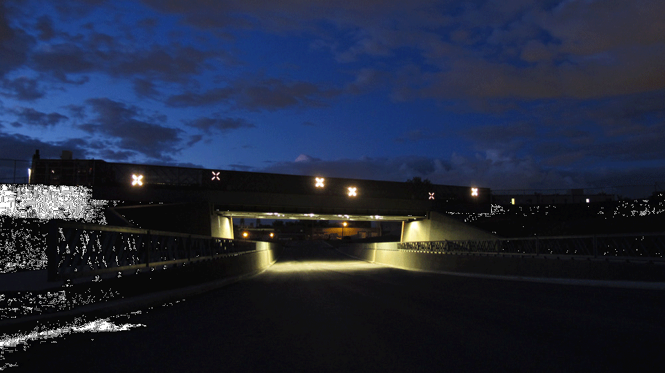 这座桥梁位于蒙特利尔大学新校区的一侧,桥体上不断变换的灯光设计成为了这个区域中不可多得的动态景观。在接下来的一段时间,蒙特利尔大学会成为该区域主要的教育机构,大学校园扩张后会占用一个前铁路整备场。现有的轨道会被移走以适应场地新的功能,同时为了保证校园周边的交通,一座高架桥会联通新的校址和主要交通枢纽。高架桥下方的空间会被降低,保证机动车的快速交通;桥梁两端会建有稍稍抬高的护坡,以容纳 24 米长的钢结构桥梁。混凝土基座向外延伸,形成曲折的挡土墙,产生动态的模拟矿山景观。