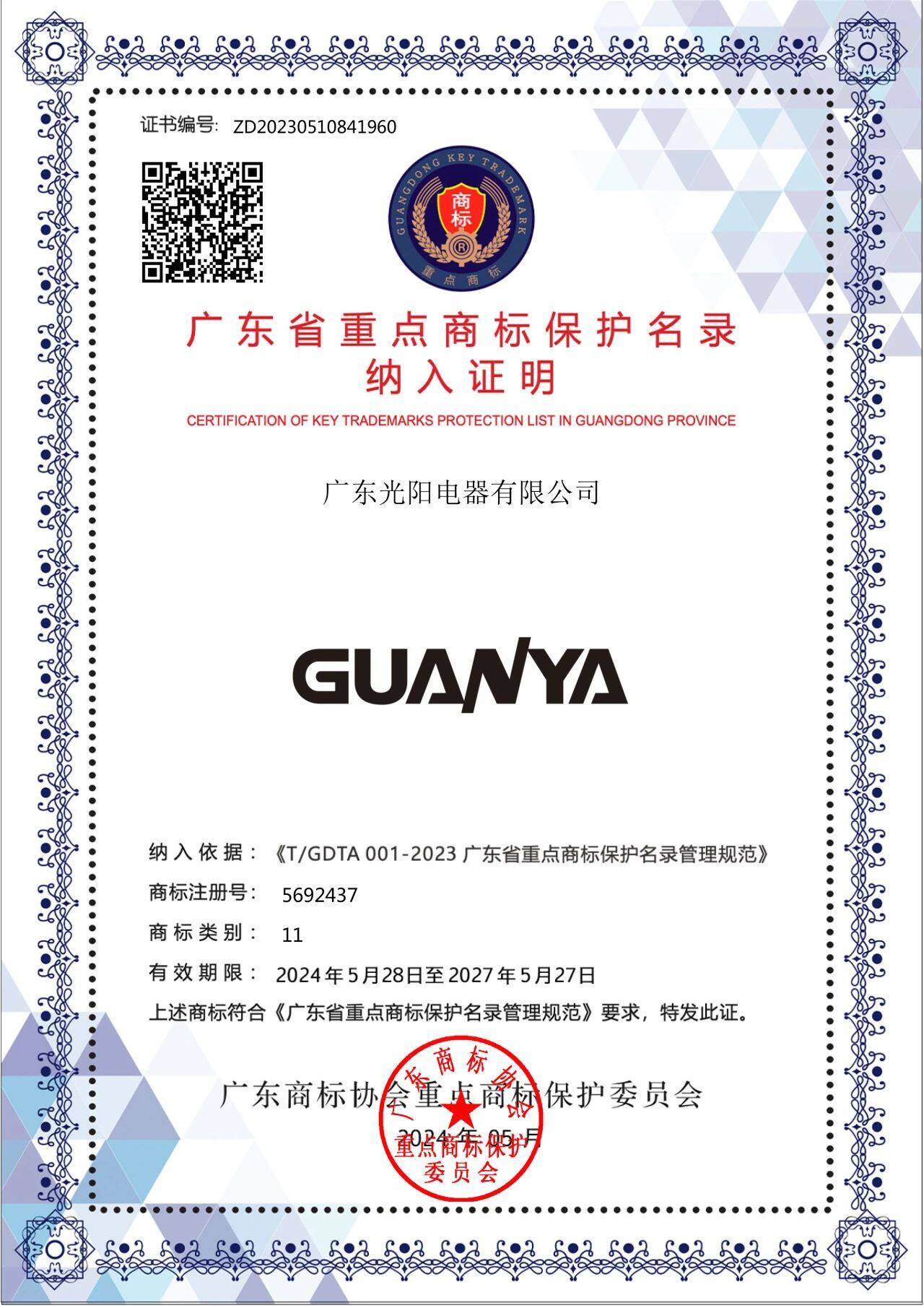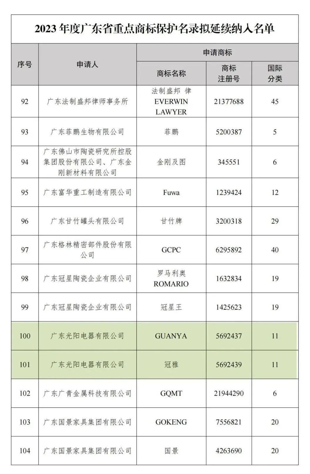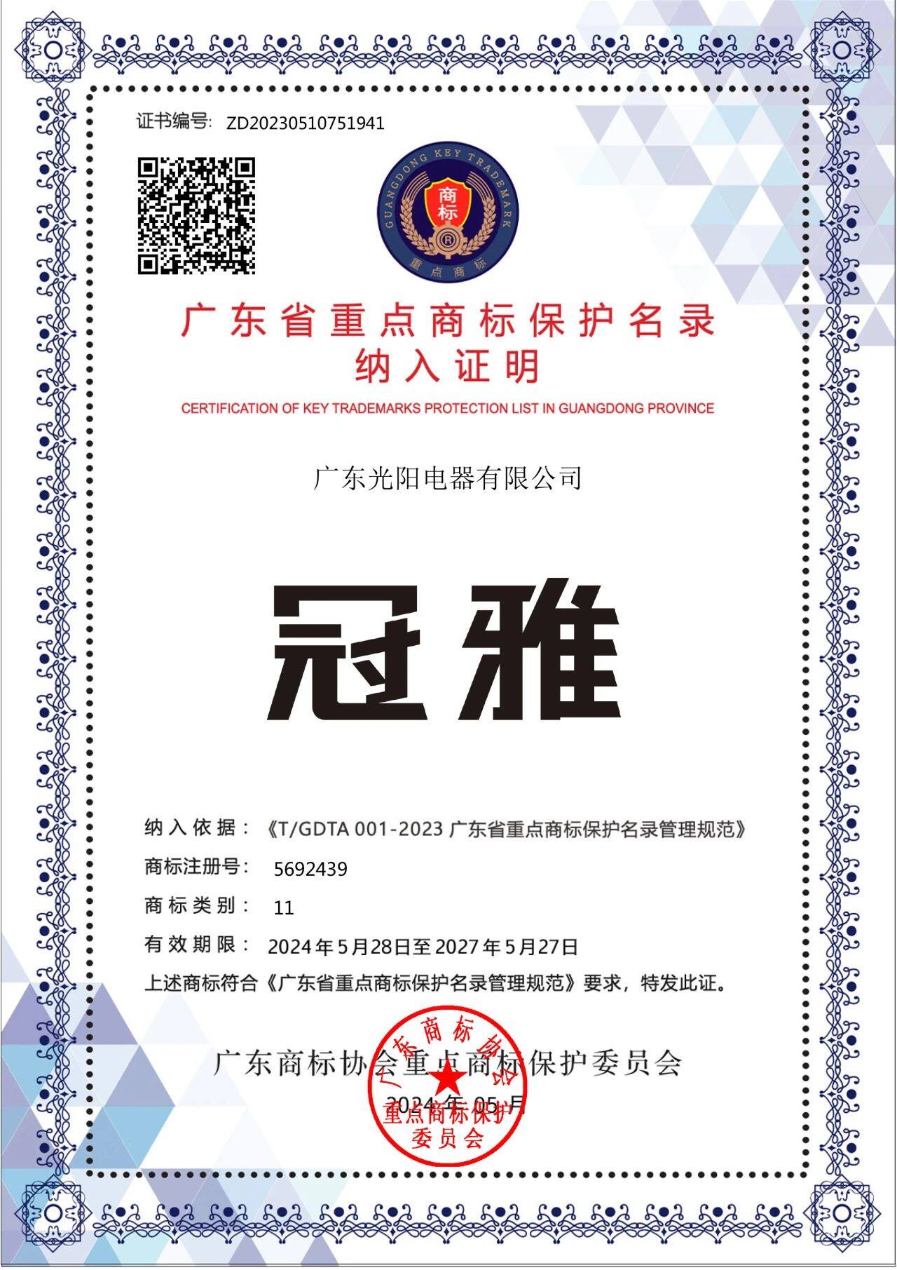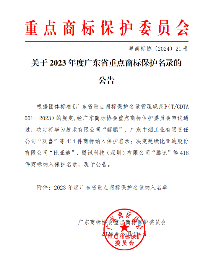 2024年5月28日,广东商标协会重点商标保护委员会公开发布《关于2023年度广东省重点商标保护名录》,冠雅照明凭借其卓越的品牌影响力和市场认可度,与“华为、腾讯、比亚迪、格力……”等商标一起实力登榜,成为广东省重点商标保护对象之一。