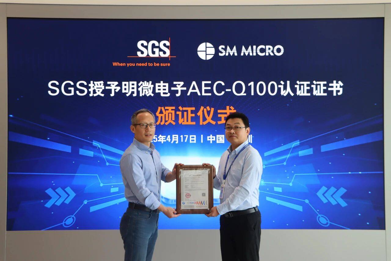 明微SM6808NQ芯片通过汽车电子可靠性测试体系中全方位的关键指标测试,达到AEC-Q100车规认证的标准。4月17日,SGS中国半导体及可靠性事业部高级经理徐创鸽到明微电子颁发SM6808NQ的“AEC-Q100认证证书”。