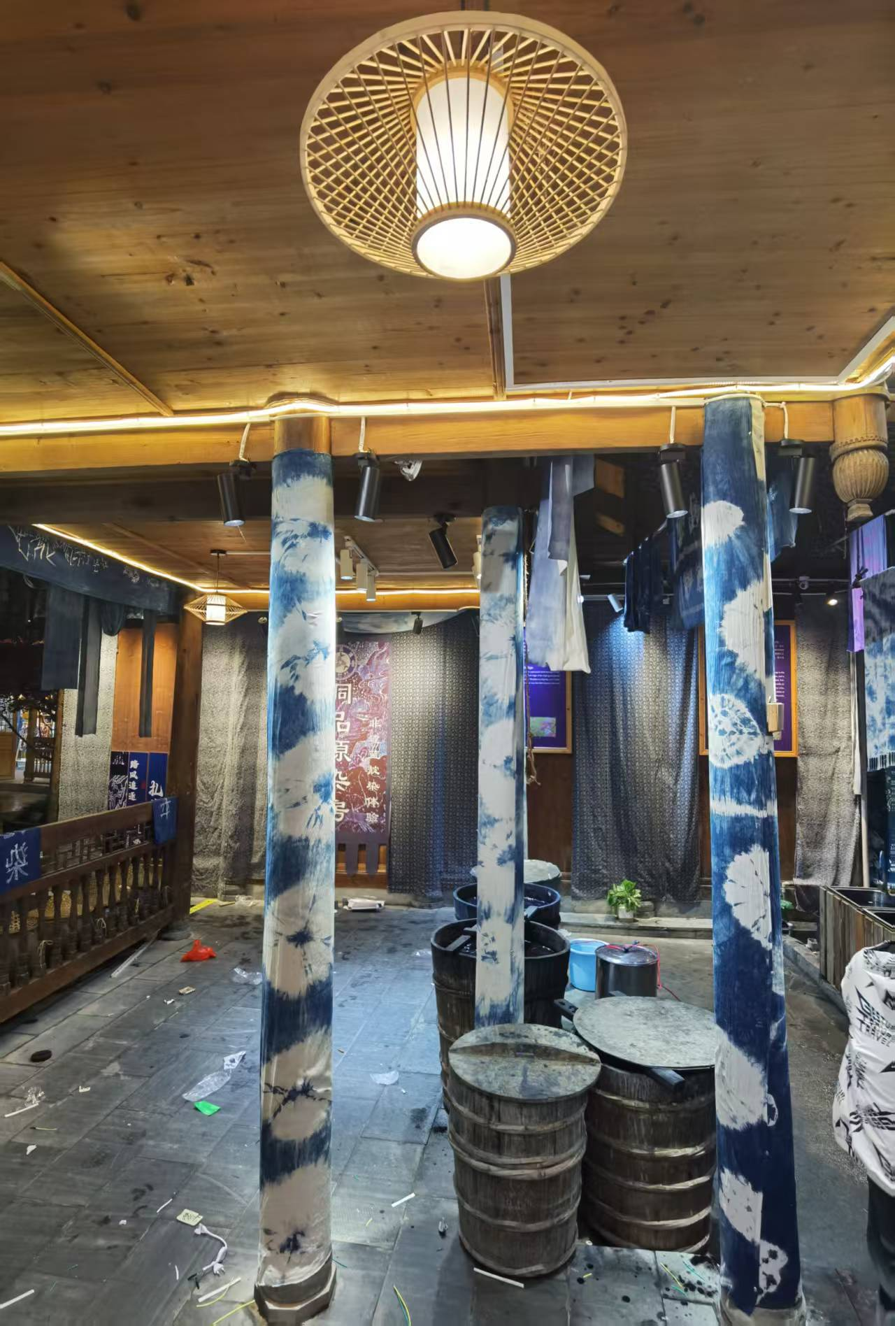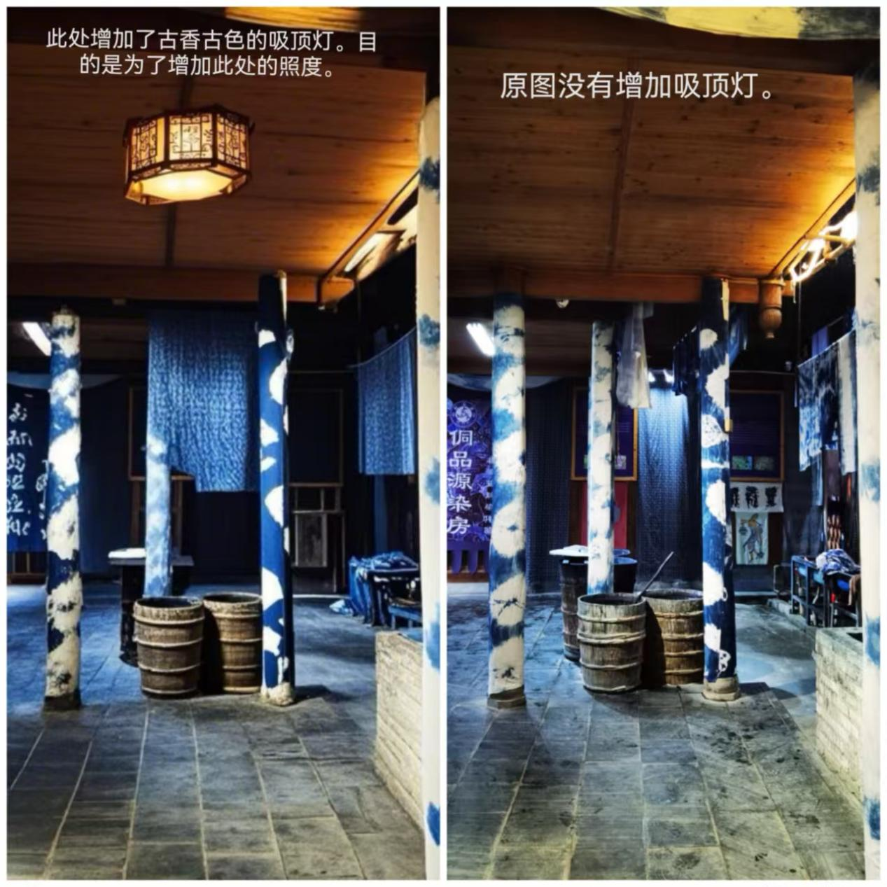 蜡染区:作为承载非物质文化遗产的蜡染工艺房,此空间弥漫着古朴的韵味,是体验蓝白艺术匠心的场所。内设有染缸、蜡染池等,以及展示的蜡染布料,昏黄的灯光与通道旁的立柱共同守护着这份古老技艺的传承,体现了对传统的尊重与继承。浸染操作区以暖黄色调为主,营造出一种古朴、温馨且富含文化气息的环境。通过精心设计的灯光层次与差异,避免了强烈光线对传统氛围的破坏。主照明采用编织感吊灯与LED灯带相结合,提供均匀柔和的照明,确保空间垂直照度达到300lx±。立柱上垂直安装了小型壁灯,灯光沿着柱体向下投射,勾勒出柱身轮廓,增强了蓝白图案在柱体上的立体感,使立柱成为装饰焦点,与顶部和墙面的蜡染展示相得益彰。将视觉焦点引向靛蓝染料捅区,采用多组可调轨道窄光束射灯阵列,以800lux±的水平照度垂直照射,强化染缸和蜡染池的视觉效果。针对悬挂和墙面的蜡染布重新设计,展示色彩鲜明、图案协调的蜡染作品,以突出其精细的纹理与色彩层次。通过调整射灯的角度与亮度,精确投射光线,凸显蓝白图案中的文字“多喜乐、长安宁”。在蜡染晾晒区,布料的褶皱和花纹细节处,应用多条隐藏式暖色LED柔灯灯带和轨道射灯,嵌入悬吊于上方的横梁之间,营造出蜡染布在自然风中摇曳时,灯光照射下边缘明暗变化的立体感。染缸区域采用局部照明,突出波光粼粼的特效纹细节。