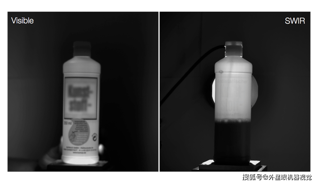 图2:SWIR照明使塑料容器的标签透明,从而可以轻松测量水基液体的填充水平。