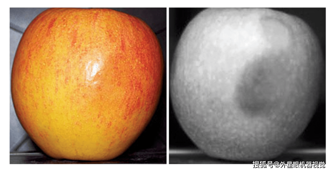 图3:使用RGB照明无法检测到苹果表面的青紫(左图)。另一方面,SWIR照明使瘀伤非常容易检测(右)。